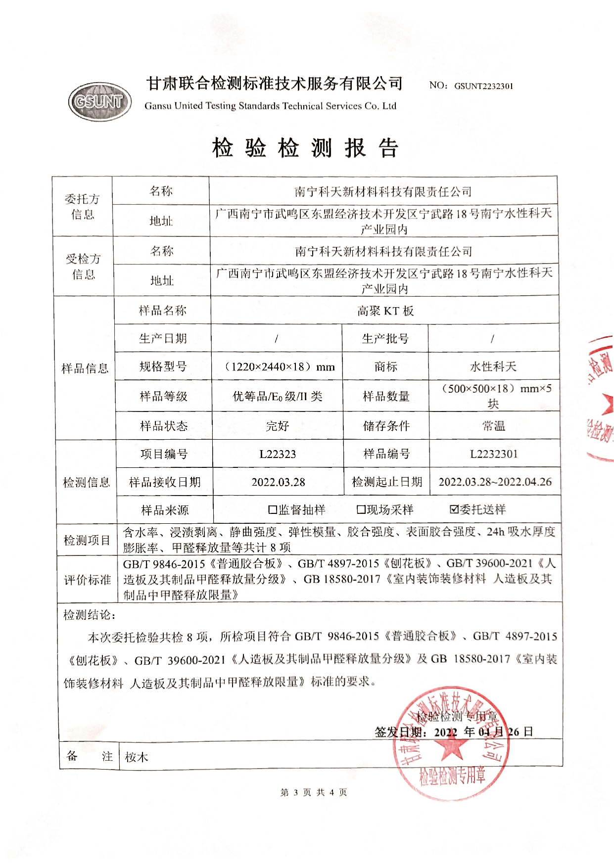 高聚KT板E0級檢測報告
